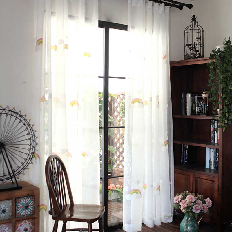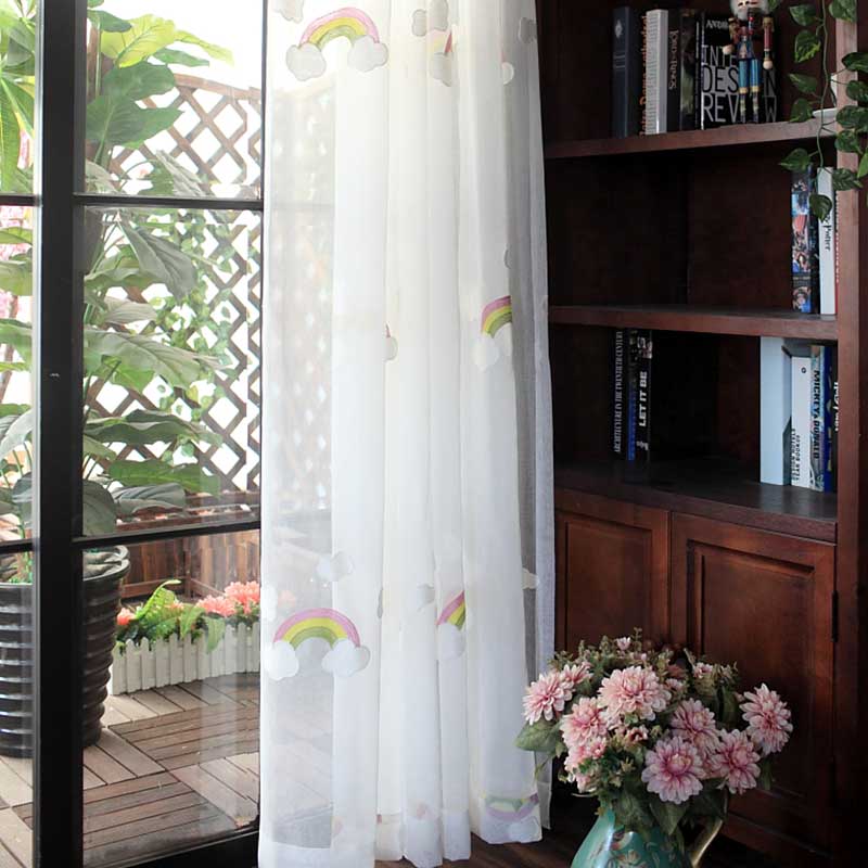 Denna barngardin med regnbågar och moln är mer än bara ett fönsterskydd; den är en del av inredningen som sätter tonen för hela rummet. Den vita, skira bakgrunden låter ljuset flöda in mjukt och skapar en behaglig känsla, samtidigt som den ger tillräckligt med avskildhet. De detaljerade broderierna ger en högkvalitativ känsla och säkerställer att gardinen håller sig vacker länge. Den är enkel att montera och underhålla, vilket gör den till ett praktiskt val för upptagna föräldrar. Ge ditt barn en rumsmiljö där drömmar och fantasier får fritt spelrum, och där varje dag känns lite ljusare och mer färgstark.