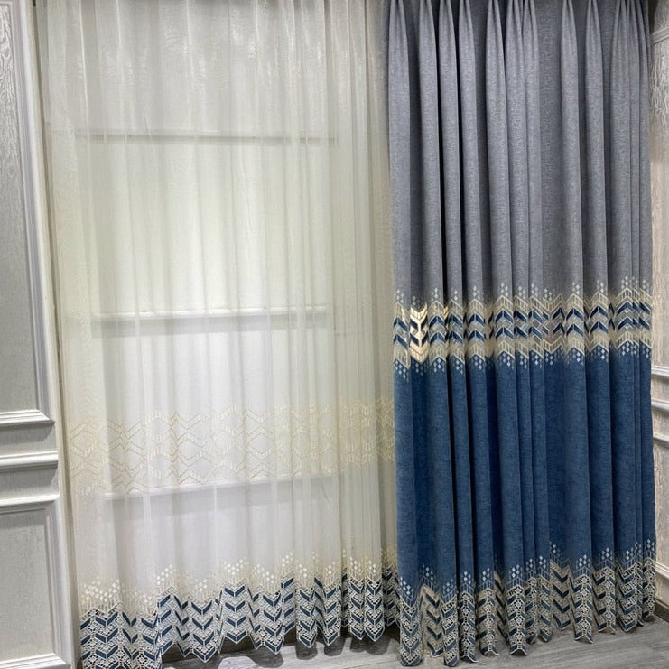 Upptäck vår fantastiska chenillegardin med broderat geometriskt mönster, perfekt för att ge ditt hem en modern och sofistikerad touch. Denna gardin är inte bara en praktisk fönsterdekoration, utan också ett konstverk som lyfter hela rummet. Tänk dig hur det rika chenilletyget faller mjukt och hur det detaljerade broderiet fångar ljuset – en syn som verkligen förvandlar din inredning. Den kombinerar elegant blåa och gråa nyanser med ett intrikat mönster, vilket skapar en dynamisk och visuellt tilltalande effekt som passar i både vardagsrum och sovrum. Låt denna vackra gardin bli mittpunkten i ditt nästa inredningsprojekt.