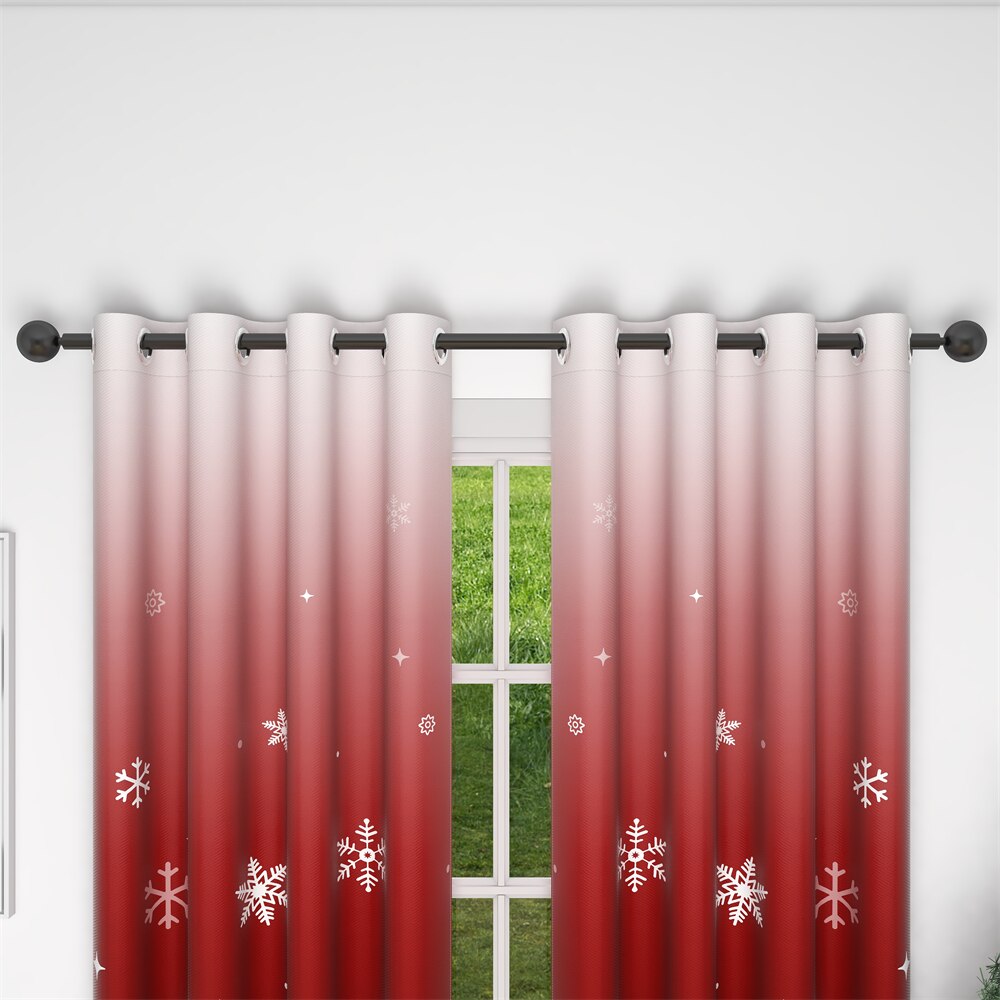 Denna Dekorativa julgardin med vita snöflingor är designad för att vara både vacker och funktionell. De runda, mörkgråa öljetterna upptill gör den enkel att hänga upp på valfri gardinstång, vilket ger dig friheten att snabbt och smidigt förvandla ditt rum. Gardinen har ett förtrollande mönster av snöflingor som faller ner över det gradvisa färgskiftet från vitt till djuprött. Snöflingorna kommer i olika former och storlekar, vilket ger en dynamisk och lekfull känsla som påminner om en riktig snöstorm utanför fönstret. De vita detaljerna mot den röda bakgrunden skapar en slående kontrast som verkligen fångar ögat och blir ett samtalsämne bland gästerna. Det är den perfekta detaljen för att komplettera din julgran och andra juldekorationer.