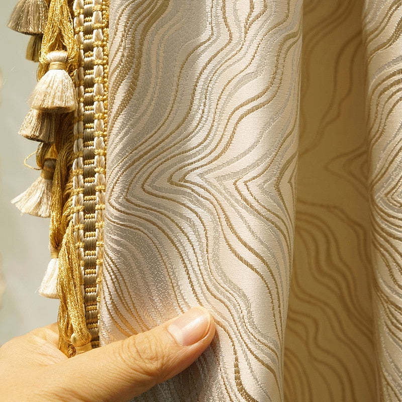 Föreställ dig att du kliver in i ett rum där varje detalj andas elegans och komfort. Med vår Lyxig mörkläggningsgardin i klassisk stil Azoia kan du enkelt förvandla ditt hem till en sådan plats. Dessa gardiner är inte bara en praktisk lösning för att blockera oönskat ljus, utan också ett statement-plagg som lyfter din inredning till nya höjder. Den rika, beige nyansen och de intrikata guldiga detaljerna, inklusive tofsar och en vackert snirklig kant, ger en känsla av tidlös lyx som passar perfekt i sovrum, vardagsrum eller andra utrymmen där du önskar en sofistikerad atmosfär. Låt Azoia-gardinerna omfamna ditt rum med sin skönhet och funktionalitet, och skapa en miljö där du kan koppla av och njuta i fullständig komfort.