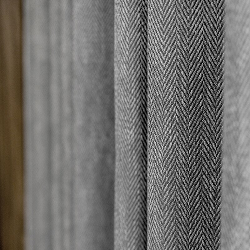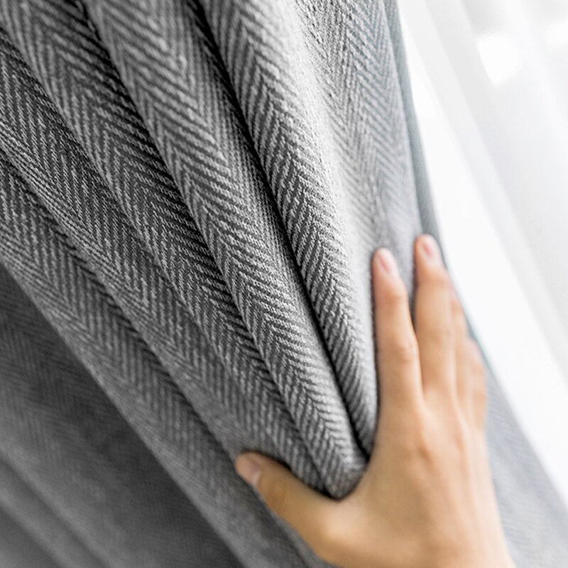 Upplev total mörkläggning med vår mörkgrå mörkläggningsgardin Valego med fiskbensmönster