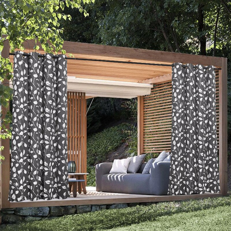 Denna mörkgrå utomhusgardin med vitt lövmönster är den perfekta detaljen för att förhöja din utomhusmiljö.