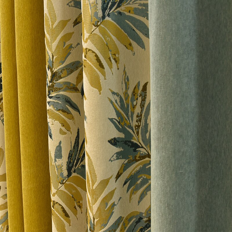 Förvandla ditt hem till en lugn oas med vår eleganta mörkläggningsgardin. Designad för att erbjuda både stil och funktion, ger denna gardin dig den perfekta balansen mellan mörker och en touch av naturens skönhet. Föreställ dig att vakna upp utvilad efter en god natts sömn, eller njuta av en mysig filmkväll utan störande ljusinsläpp. Gardinen har ett vackert botaniskt lövmönster i lugnande grågröna och senapsgula nyanser, som elegant kompletterar den dämpade gula enfärgade panelen. Den mjuka texturen och det rika mönstret skapar en inbjudande atmosfär i varje rum.
