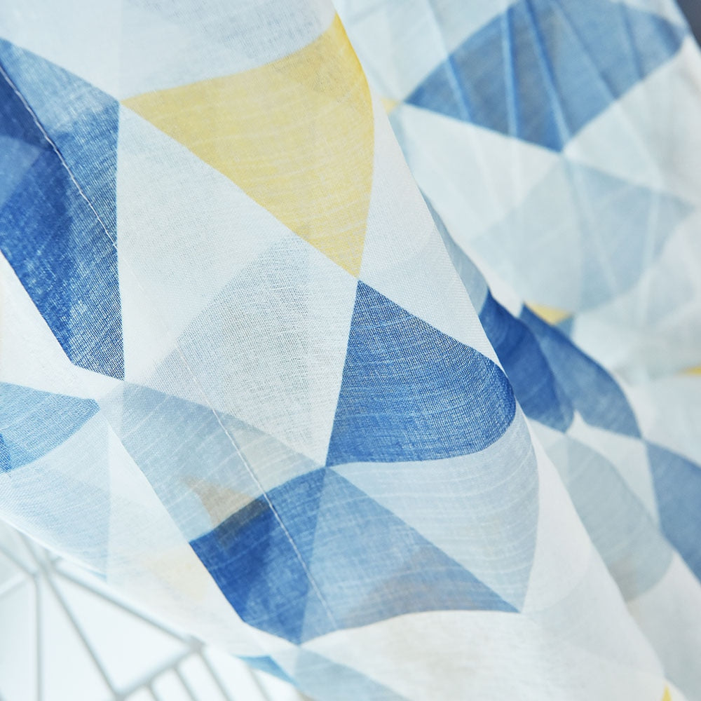 Denna gardin är mer än bara ett fönsterskydd; den är en inredningsdetalj som lyfter hela rummet. Med sitt iögonfallande geometriska triangelmönster i lugna toner av blått, gult och vitt, erbjuder den en modern estetik som passar perfekt i både klassiska och moderna hem. Den tunna, skira kvaliteten gör den idealisk för att skapa en känsla av rymd och lugn. Perfekt för vardagsrummet, sovrummet eller varför inte barnrummet? Dess mångsidighet gör den till ett utmärkt val för att enkelt uppdatera och förnya ditt hem med stil och finess. Du kommer att älska hur den leker med ljuset och adderar en subtil färgklick.
