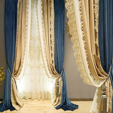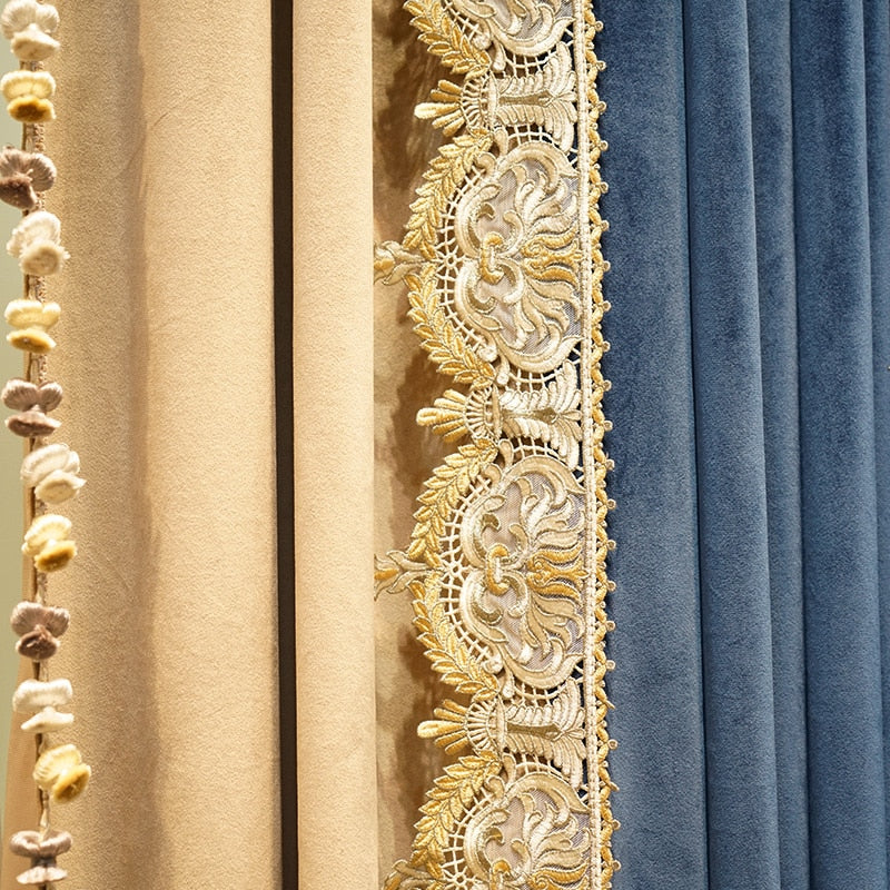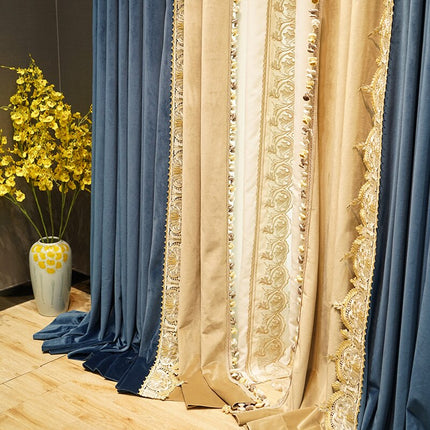 Förvandla ditt hem till en oas av lugn och stil med vår fantastiska tvåfärgade mörkläggningsgardin i sammet. Föreställ dig hur den mjuka sammetsytan smeker ljuset och ger ditt rum en lyxig känsla. Denna gardin är inte bara vacker att se på, den är också otroligt funktionell. Med sin tjocka, mörkläggande design kan du enkelt skapa den perfekta atmosfären för avkoppling, oavsett tid på dygnet. Den djupa blå färgen kombineras elegant med en varm beige ton, accentuerad av intrikata guldbroderier och charmiga tofsar. Denna gardin är perfekt för dig som uppskattar både estetik och praktiska fördelar, och som vill ge ditt hem en känsla av exklusivitet och komfort.