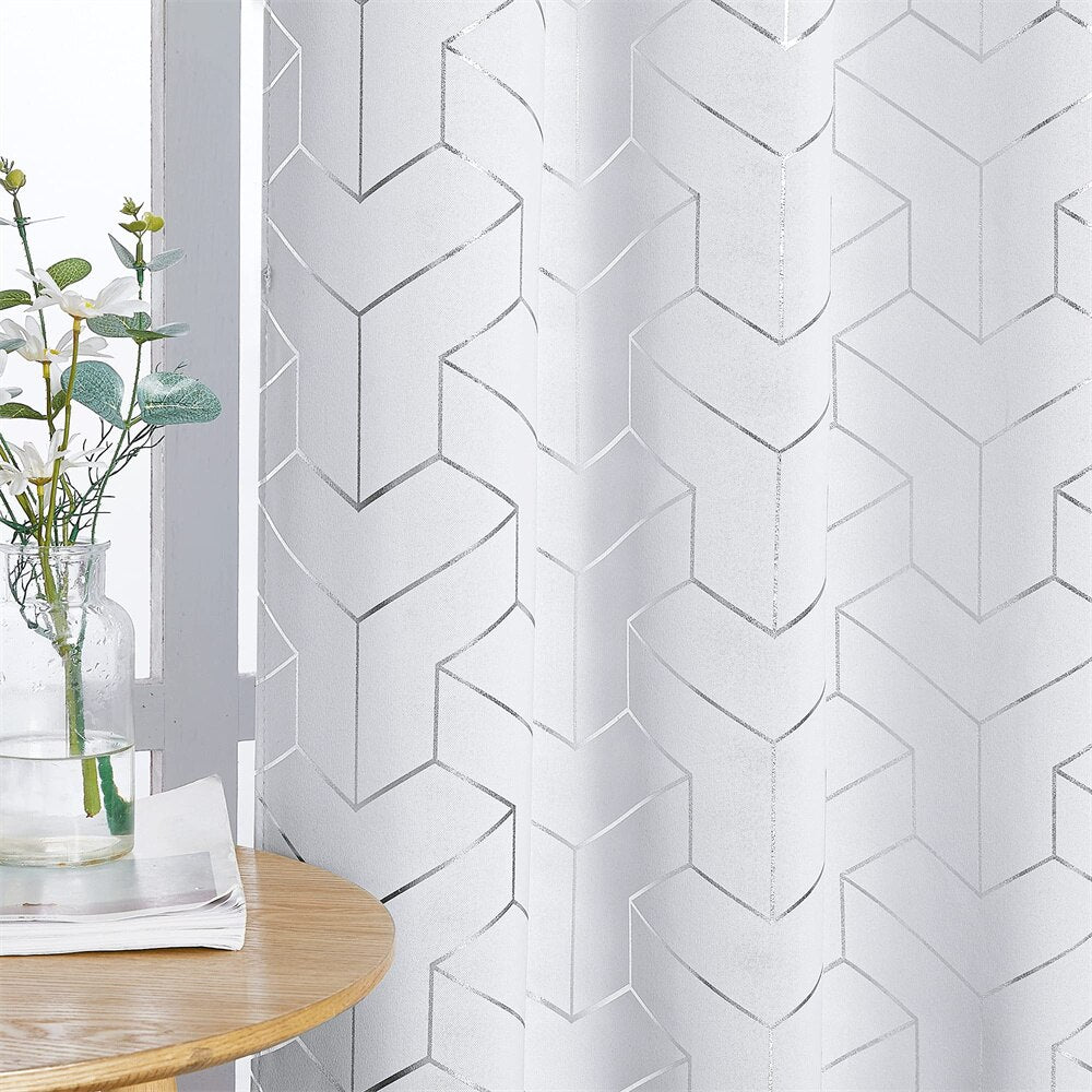 Drömmer du om ett sovrum där ljuset inte stör din skönhetssömn? Eller kanske ett vardagsrum där filmkvällen blir en riktig bio-upplevelse, utan irriterande reflexer? Då är vår vita mörkläggningsgardin med geometriskt 3D-mönster det perfekta valet för dig! Denna gardin är inte bara otroligt praktisk när det gäller att stänga ute ljuset, den är också en riktig blickfångare. Det eleganta geometriska mönstret i subtila silvertoner skapar en modern och sofistikerad känsla som lyfter hela rummet. Tänk dig att vakna utvilad, eller njuta av en mysig atmosfär när du vill koppla av. Denna gardin ger dig möjligheten att kontrollera ljuset och skapa den stämning du önskar, samtidigt som den bidrar med en touch av minimalistisk lyx.